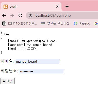 실행화면에 출력된 array 내의 value 들은 각각 입력받은 값을 [name]=value 형태로 보여주고 있다.