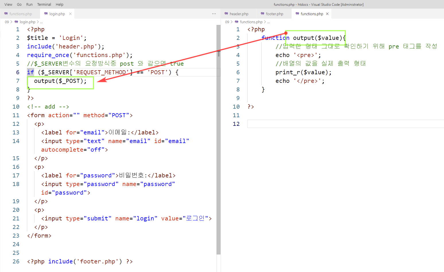 - login.php 의 내용을 output 함수를 출력하도록 수정